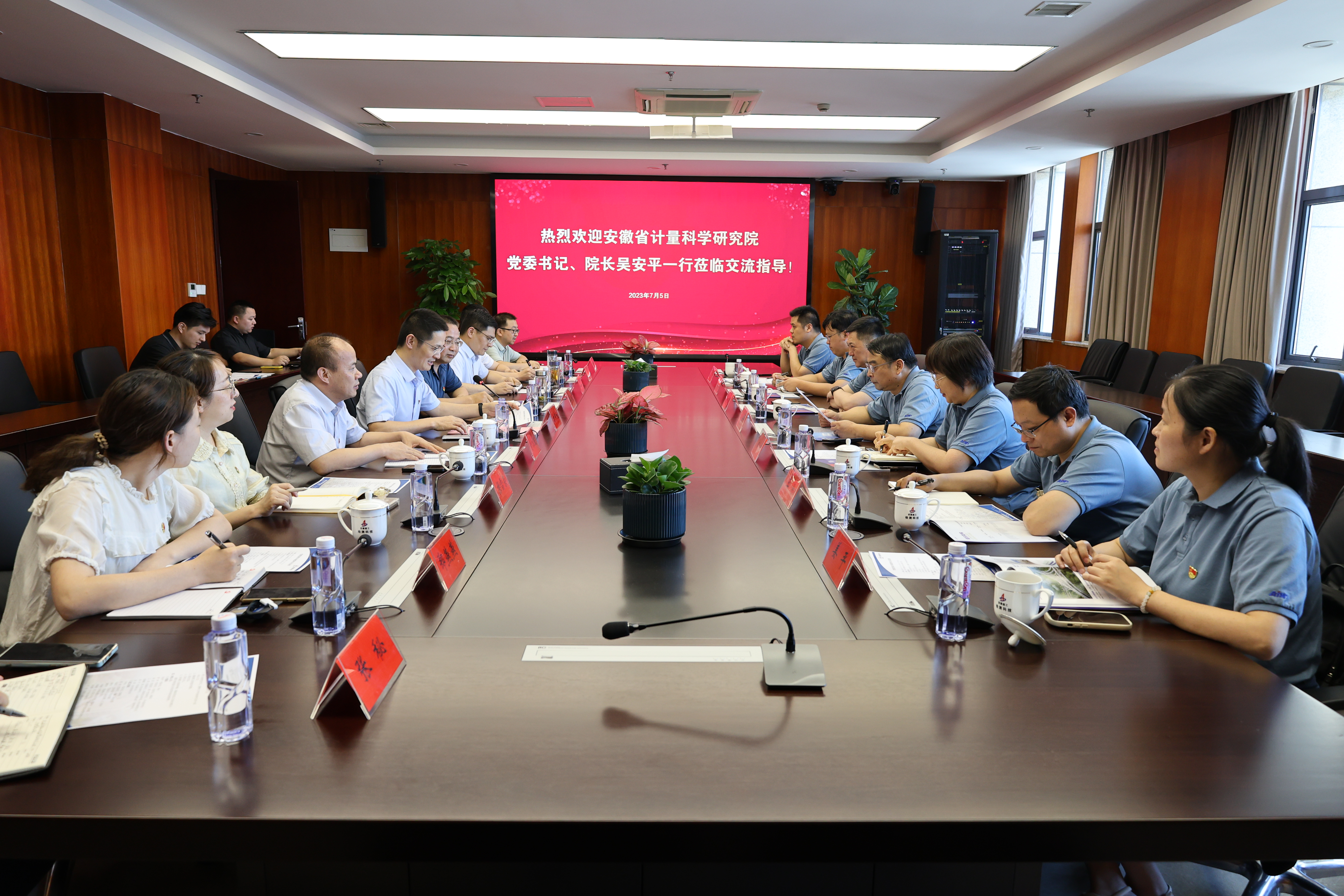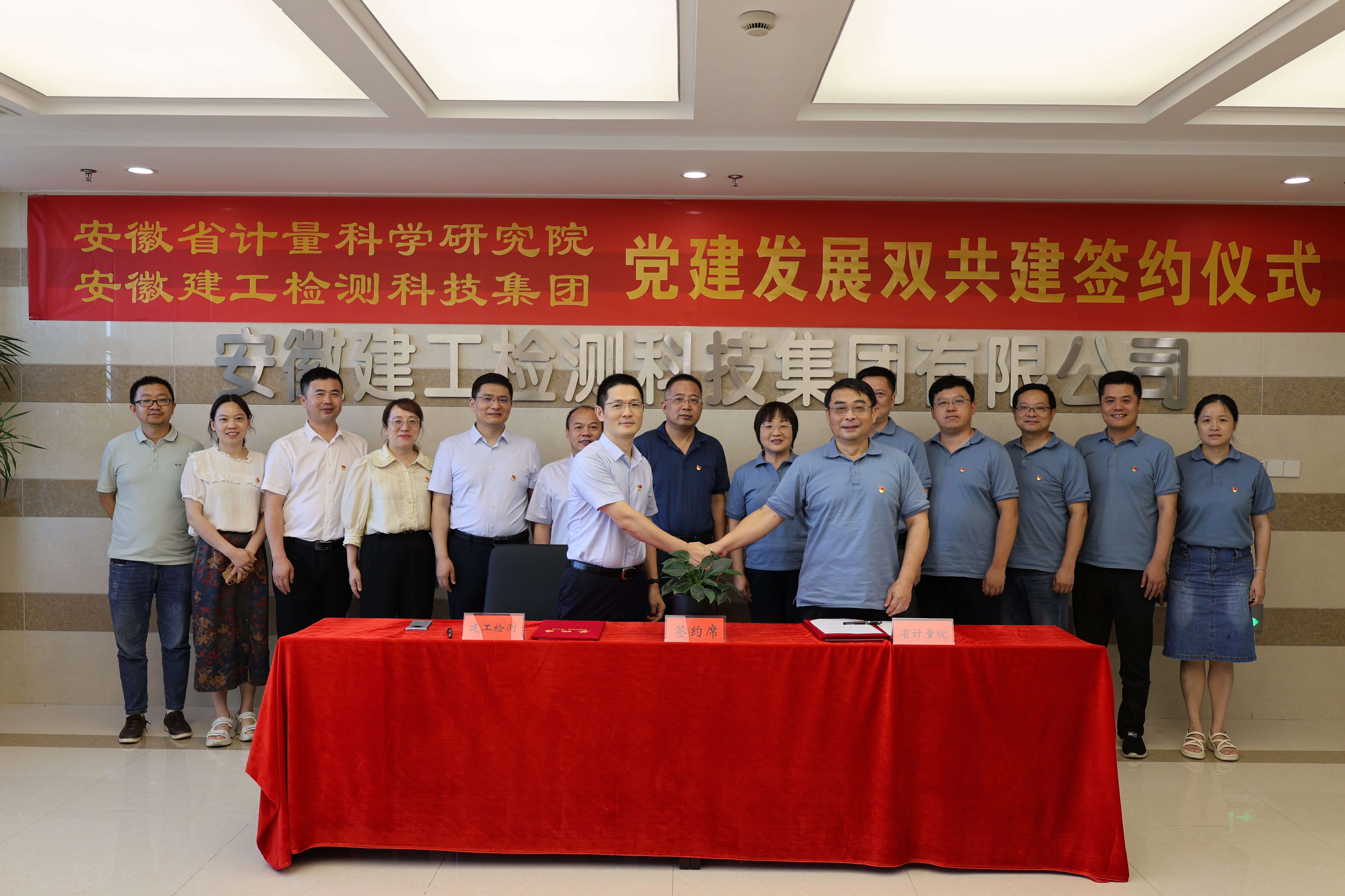 為推動習近平新時代中國特色社會主義思想主題教育走深走實,促進黨建發展雙融合同提高,7月5日下午,安徽省計量科學研究院黨委書記、院長吳安平率隊來安徽建工檢測科技集團有限公司開展黨建發展“雙共建”活動。公司黨委書記、董事長方申柱熱情接待。